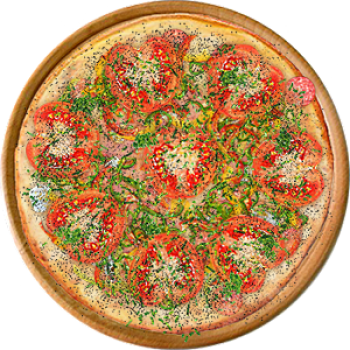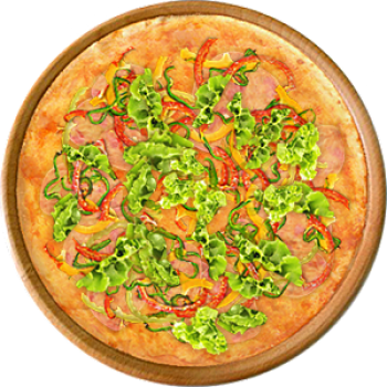 Основа: Традиционная (толстое тесто ⌀35см) (650 г) Соус: Соус красный (100 г) Топпинги: Болгарский перец (50 г), Зеленый салат (50 г), Ветчина (100 г), Сырное ассорти (100 г) Доп. топпинги: - нет -