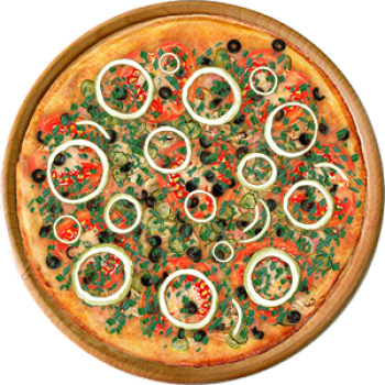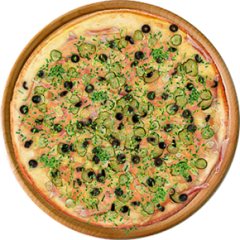 Основа: Итальянская (тонкое тесто ⌀35см) (400 г) Соус: Соус красный (100 г) Топпинги: Балык (50 г), Шампиньоны (50 г), Сыр (50 г), Огурчики (50 г), Помидоры (50 г), Маслины (50 г), Ветчина (100 г) Доп. топпинги: Лук зелёный (20 г), Лук репчатый (35 г)