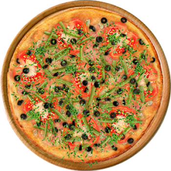 Основа: Итальянская (тонкое тесто ⌀35см) (400 г) Соус: Соус красный (100 г) Топпинги: Помидоры (50 г), Фасоль стручковая (50 г), Маслины (50 г), Ветчина (100 г), Курица копченая (100 г), Сыр (100 г) Доп. топпинги: Зелень (10 г)