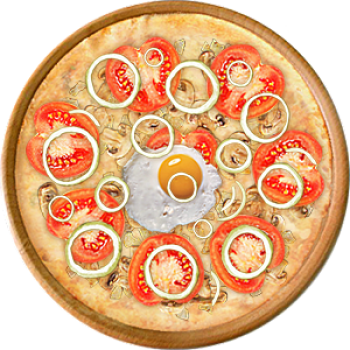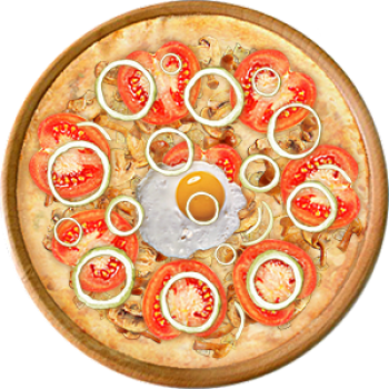 Основа: Традиционная (толстое тесто ⌀35см) (650 г) Соус: Соус белый (100 г) Топпинги: Грибное ассорти (50 г), Сыр (50 г), Помидоры (50 г), Яйцо куриное (50 г), Курица копченая (100 г) Доп. топпинги: Лук репчатый (35 г)