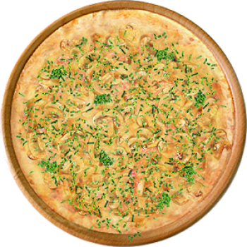 Основа: Традиционная (толстое тесто ⌀35см) (650 г) Соус: Соус белый (100 г) Топпинги: Ветчина (50 г), Салями (50 г), Грибное ассорти (50 г), Шампиньоны (50 г), Сыр (50 г), Сырное ассорти (50 г) Доп. топпинги: Зелень (10 г)