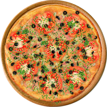 Основа: Итальянская (тонкое тесто ⌀35см) (400 г) Соус: Соус красный (100 г) Топпинги: Помидоры (50 г), Маслины (50 г), Ветчина (100 г), Курица копченая (100 г), Сыр (100 г) Доп. топпинги: Зелень (10 г)