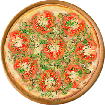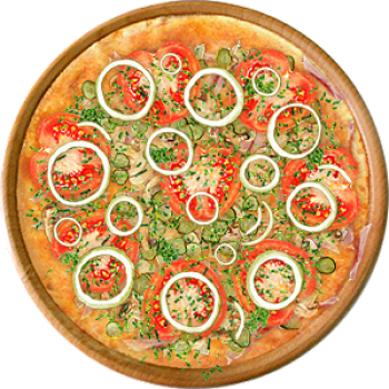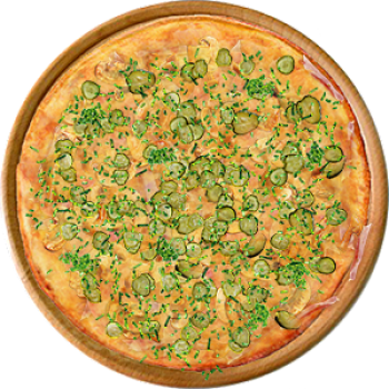 Основа: Итальянская (тонкое тесто ⌀35см) (400 г) Соус: Соус белый (100 г) Топпинги: Ветчина (50 г), Шампиньоны (50 г), Сыр (50 г), Огурчики (50 г), Помидоры (50 г) Доп. топпинги: Зелень (10 г)