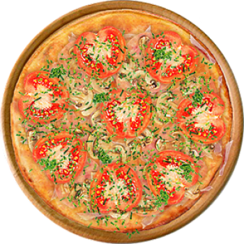 Основа: Итальянская (тонкое тесто ⌀35см) (400 г) Соус: Соус красный (100 г) Топпинги: Бекон (50 г), Ветчина (50 г), Шампиньоны (50 г), Сыр (50 г), Помидоры (50 г) Доп. топпинги: Зелень (10 г)