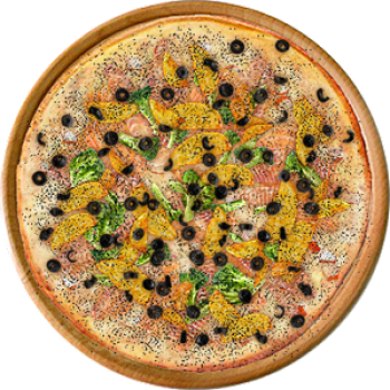 Основа: Итальянская (тонкое тесто ⌀35см) (400 г) Соус: Соус белый (100 г) Топпинги: Помидоры (50 г), Маслины (50 г), Ветчина (100 г), Курица копченая (100 г), Сыр (100 г) Доп. топпинги: Зелень (10 г)