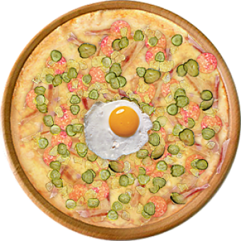 Основа: Традиционная (толстое тесто ⌀35см) (650 г) Соус: Соус белый (100 г) Топпинги: Бекон (50 г), Копченые колбаски (50 г), Курица копченая (50 г), Сырное ассорти (50 г), Огурчики (50 г), Яйцо куриное (100 г) Доп. топпинги: - нет -