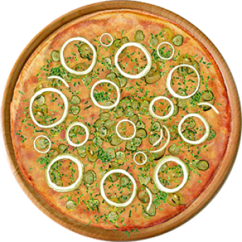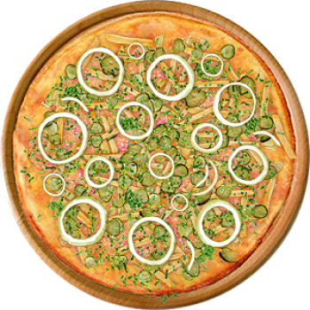 Основа: Итальянская (тонкое тесто ⌀35см) (400 г) Соус: Соус чили (100 г) Топпинги: Сыр (50 г), Сырное ассорти (50 г), Огурчики (50 г), Халапеньо (50 г) Доп. топпинги: Зелень (10 г), Лук репчатый (35 г)