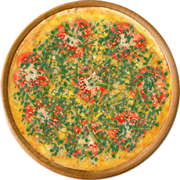 Основа: Традиционная (толстое тесто ⌀35см) (650 г) Соус: Соус сырный (100 г) Топпинги: Курица копченая (50 г), Сыр (50 г), Кукуруза (50 г), Помидоры (50 г), Фасоль стручковая (50 г) Доп. топпинги: Кунжут (10 г), Лук зелёный (20 г)