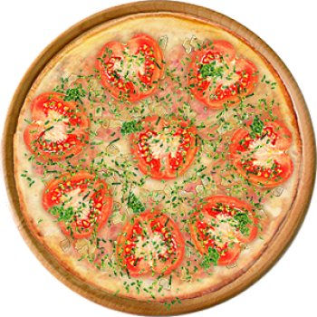 Основа: Итальянская (тонкое тесто ⌀35см) (400 г) Соус: Соус белый (100 г) Топпинги: Ветчина (100 г), Курица копченая (100 г), Сыр (100 г), Помидоры (100 г) Доп. топпинги: Зелень (10 г)