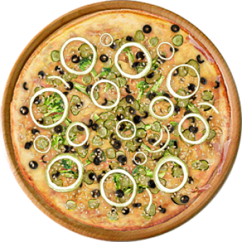 Основа: Итальянская (тонкое тесто ⌀35см) (400 г) Соус: Соус красный (100 г) Топпинги: Балык (50 г), Сырное ассорти (50 г), Огурчики (50 г), Маслины (50 г), Ветчина (100 г) Доп. топпинги: Зелень (10 г), Лук репчатый (35 г)